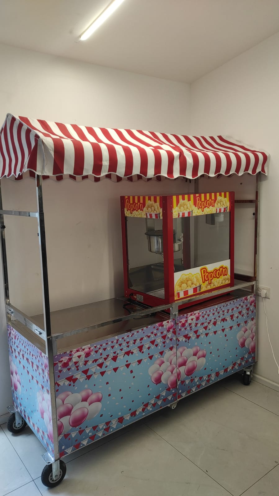 הפתרון המושלם לאירועים, ירידים ומכירות שטח: דוכן מרווח באורך 180 ס"מ עם משטחי עבודה מנירוסטה, מתקפל לנשיאה ואחסון קלים, ומגיע עם חופה דקורטיבית בפסים אדום-לבן לנראות מושכת.