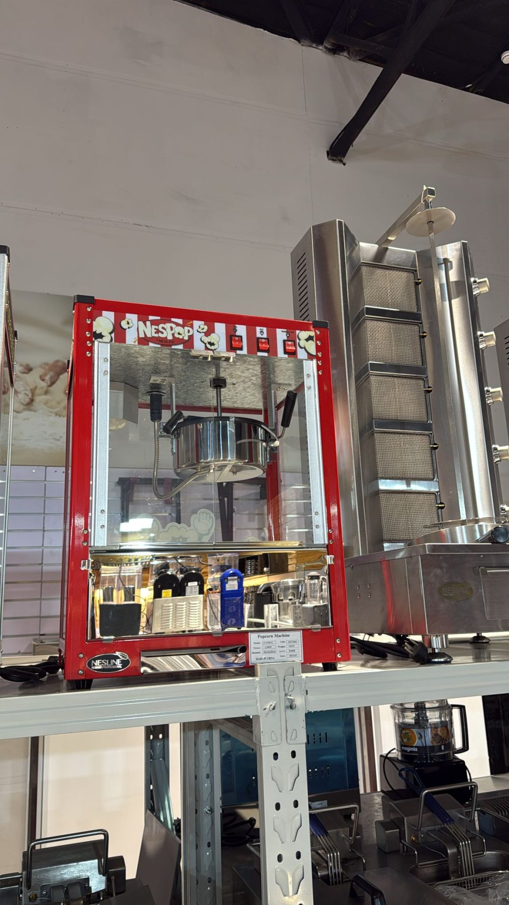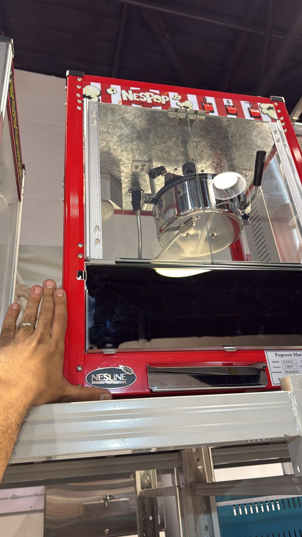 מכונת פופקורן תעשיתית עם חימום מהיר, מכונה אמינה ואיכותית, בעלות סיר נירוסטה מתהפך.