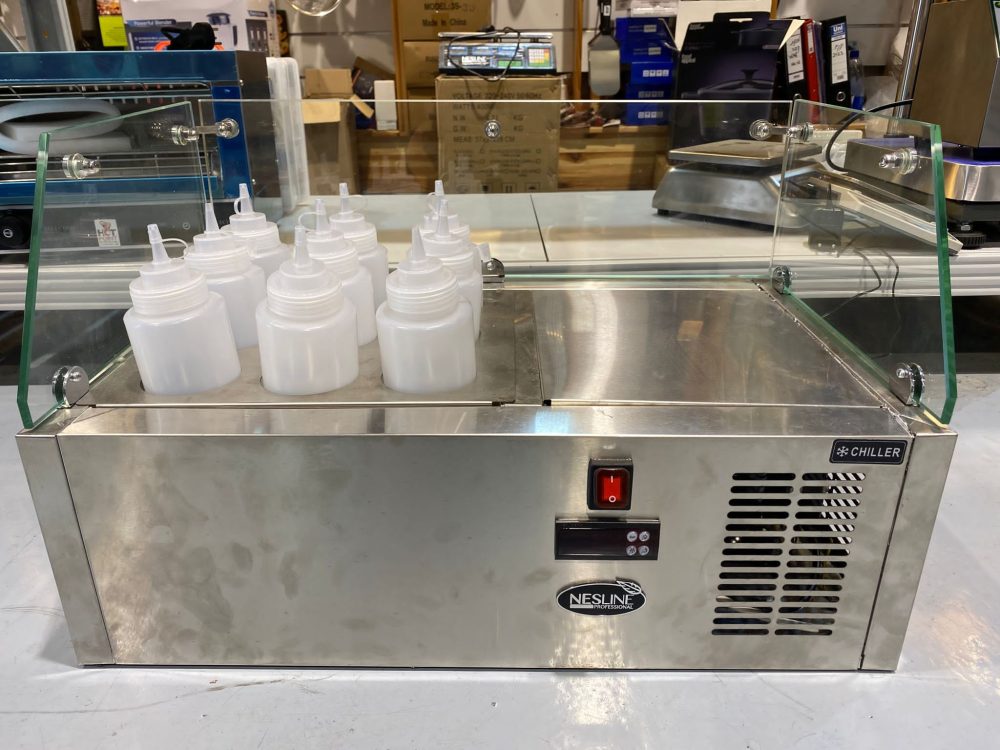 מקרר נירוסטה עבור 9 בקבוקי רטבים עשוי נירוסטה במידות: 670/395/215 מ"מ נסליין, ניתן להשתמש גם עבור 6 גסט' 1/9, מאים לשימרה על טריות רטבים, ממרחים, ירקות, תוספות קרות וכד'… למקרר מגן עיטוש מזכוכית